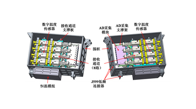 8路KA波段接收通道,放大滤波后直接检波形成检波电压输出送给后端采样及信号处理电路,具有恒温功能保证接收通道的幅度相位稳定。
