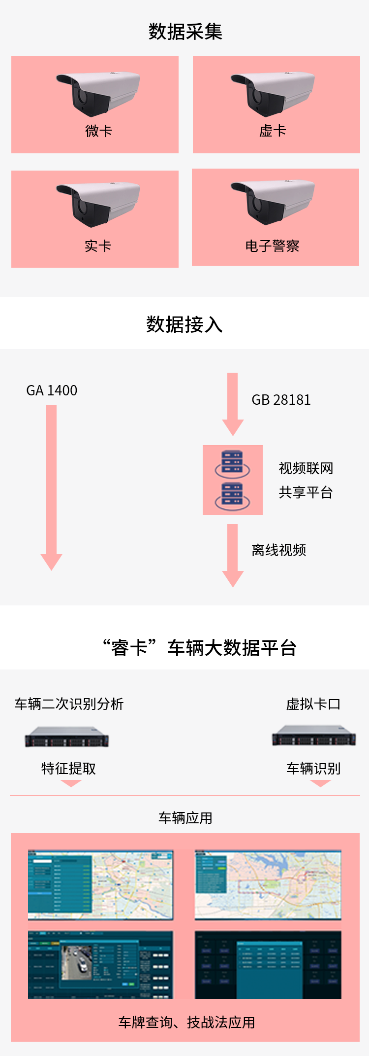 “睿卡”车辆大数据平台是一款能够复用城市高清治安监控摄像机,利用视频分析技术、大数据技术实现车辆抓拍、特征识别和车辆技战法等功能的平台,为综治、公安、城管等部门提供决策支持。